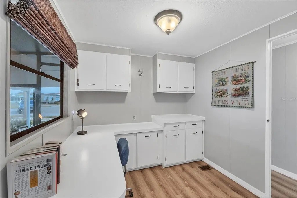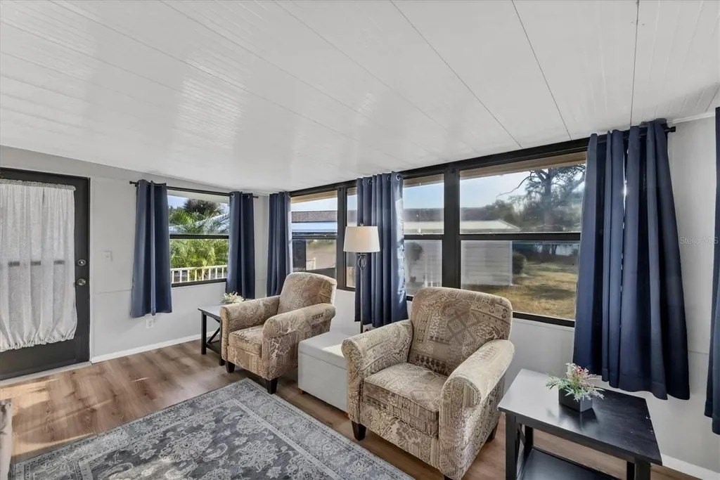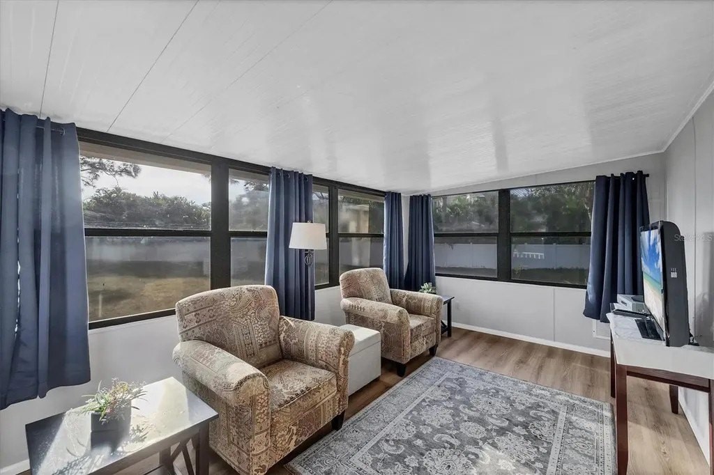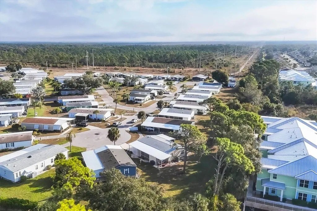 A very well-maintained home, on a quiet cul-de-sac and located in an X Flood Zone! This highly sought-after gated community of Tangerine Woods, is an active and friendly, 55 and over community, where you own the land your home is located on. For your leisurely pleasure, this community provides you with a large heated pool and clubhouse, an exercise room and library, tennis and pickleball courts, walking trails, shuffleboard, and so much more! This light and bright, color coordinated, turnkey furnished and beautifully maintained home, has renovations galore. A neat and clean home with a brand-new roof and A/C in 2023, new carport, new screened patio, new Laminate Plank flooring, new curtains, and new interior and exterior paint. The kitchen offers newer cabinets and marble look countertops, a pantry and a breakfast bar. The living room is stylishly furnished and decorated; the dinette includes a built-in cabinet, and the air-conditioned Florida room is just perfect for additional entertaining space. A spacious master bedroom, complete with 2 closets, is sure to provide all the comforts a master bedroom should, including an en suite bathroom, 2 sinks, a vanity, and a double door step in shower. The tastefully decorated guest bedroom has a walk-in closet, Berber carpet, and 2 twin beds to form a king size bed, as pictured. The bonus room can serve as an office, hobby room or additional storage space, is complete with counter/desk space, cupboards, and an exit to the outdoor lanai. The screened lanai off the carport is just perfect for enjoying our wonderful Florida weather. The shed, with its washer and dryer, has room for a work bench. There is also a small additional patio overlooking the private yard. The low monthly HOA payment of $226 includes cable TV, internet and grass cutting, and Tangerine Woods is pet friendly! This community is close to Historic Dearborn St., which provides casual dining, evening entertainment, locally owned shops and a Farmers Market on Thursdays. The local beaches are just 4 miles away, as well as many local golf courses, and world class fishing! Make your appointment today to see this meticulously cared for home, as it won't last long!
