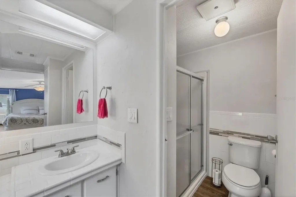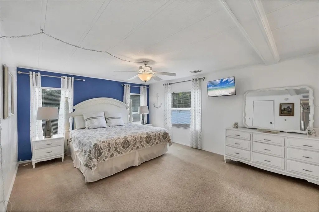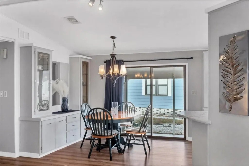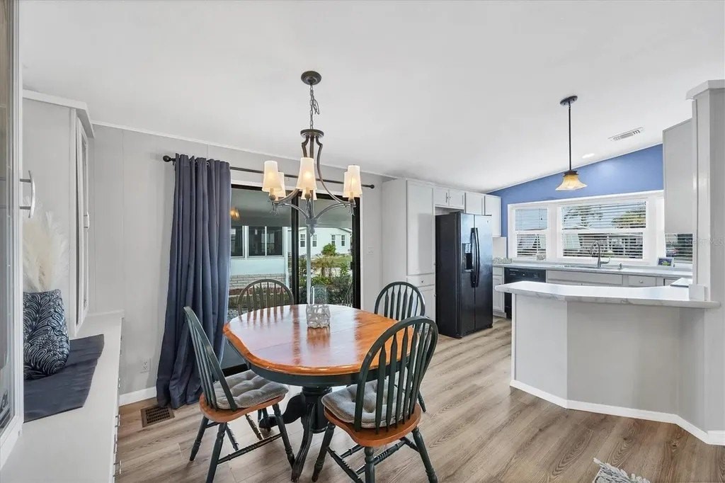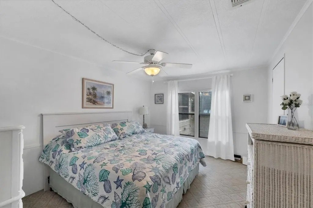 A very well-maintained home, on a quiet cul-de-sac and located in an X Flood Zone! This highly sought-after gated community of Tangerine Woods, is an active and friendly, 55 and over community, where you own the land your home is located on. For your leisurely pleasure, this community provides you with a large heated pool and clubhouse, an exercise room and library, tennis and pickleball courts, walking trails, shuffleboard, and so much more! This light and bright, color coordinated, turnkey furnished and beautifully maintained home, has renovations galore. A neat and clean home with a brand-new roof and A/C in 2023, new carport, new screened patio, new Laminate Plank flooring, new curtains, and new interior and exterior paint. The kitchen offers newer cabinets and marble look countertops, a pantry and a breakfast bar. The living room is stylishly furnished and decorated; the dinette includes a built-in cabinet, and the air-conditioned Florida room is just perfect for additional entertaining space. A spacious master bedroom, complete with 2 closets, is sure to provide all the comforts a master bedroom should, including an en suite bathroom, 2 sinks, a vanity, and a double door step in shower. The tastefully decorated guest bedroom has a walk-in closet, Berber carpet, and 2 twin beds to form a king size bed, as pictured. The bonus room can serve as an office, hobby room or additional storage space, is complete with counter/desk space, cupboards, and an exit to the outdoor lanai. The screened lanai off the carport is just perfect for enjoying our wonderful Florida weather. The shed, with its washer and dryer, has room for a work bench. There is also a small additional patio overlooking the private yard. The low monthly HOA payment of $226 includes cable TV, internet and grass cutting, and Tangerine Woods is pet friendly! This community is close to Historic Dearborn St., which provides casual dining, evening entertainment, locally owned shops and a Farmers Market on Thursdays. The local beaches are just 4 miles away, as well as many local golf courses, and world class fishing! Make your appointment today to see this meticulously cared for home, as it won't last long!
